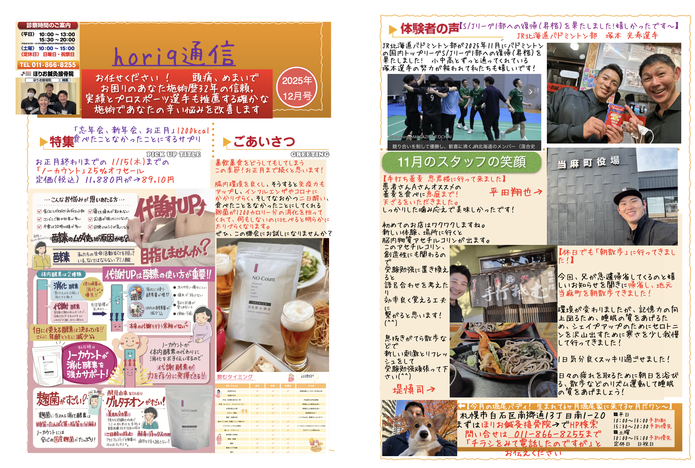 2012年4月から、ニュースレターをHORIQ通信と題して作成発行しています。 ほりお鍼灸接骨院をご利用していただいた方にお役に立てるような 自宅でもできる簡単な健康法、改めて知る自分のカラダの仕組み、 ほりお接骨院で起こった出来事、スタッフ等の紹介などの情報をお届けしております。 A4サイズの両面で1枚のニュースレターですが、 パソコンからも印刷したり、ご覧いただけるようにデータをアップしておりますので、 よろしかったらご覧下さい。