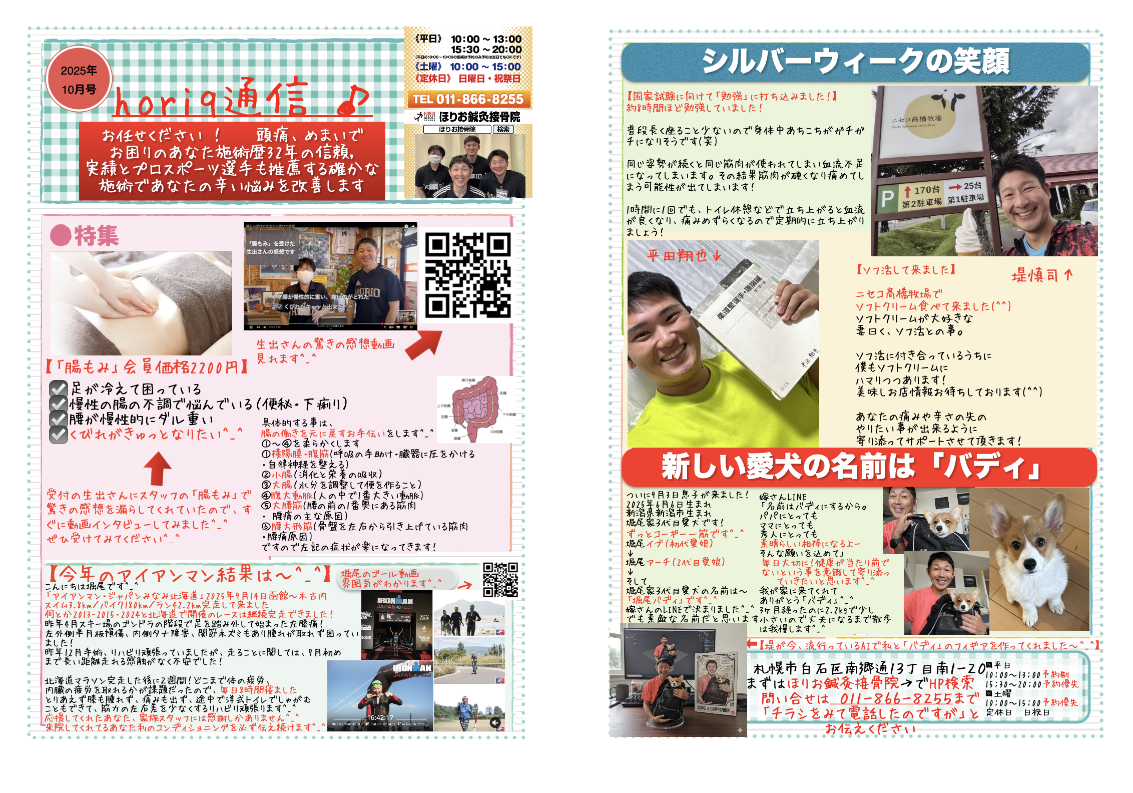 2012年4月から、ニュースレターをHORIQ通信と題して作成発行しています。 ほりお鍼灸接骨院をご利用していただいた方にお役に立てるような 自宅でもできる簡単な健康法、改めて知る自分のカラダの仕組み、 ほりお接骨院で起こった出来事、スタッフ等の紹介などの情報をお届けしております。 A4サイズの両面で1枚のニュースレターですが、 パソコンからも印刷したり、ご覧いただけるようにデータをアップしておりますので、 よろしかったらご覧下さい。