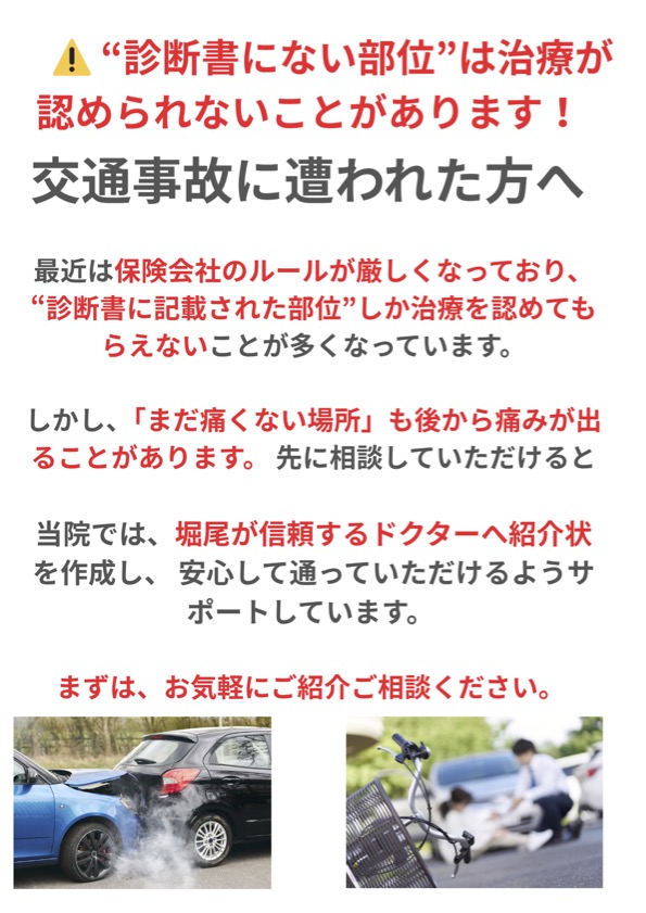施術を施すにあたって、交通事故では医師の診断が必要となりますので 必ず病院で診断を受ける必要があるのですが心配でしたら私が信頼しているコンサドーレ札幌トレーナー時にお世話になった先生方がいる